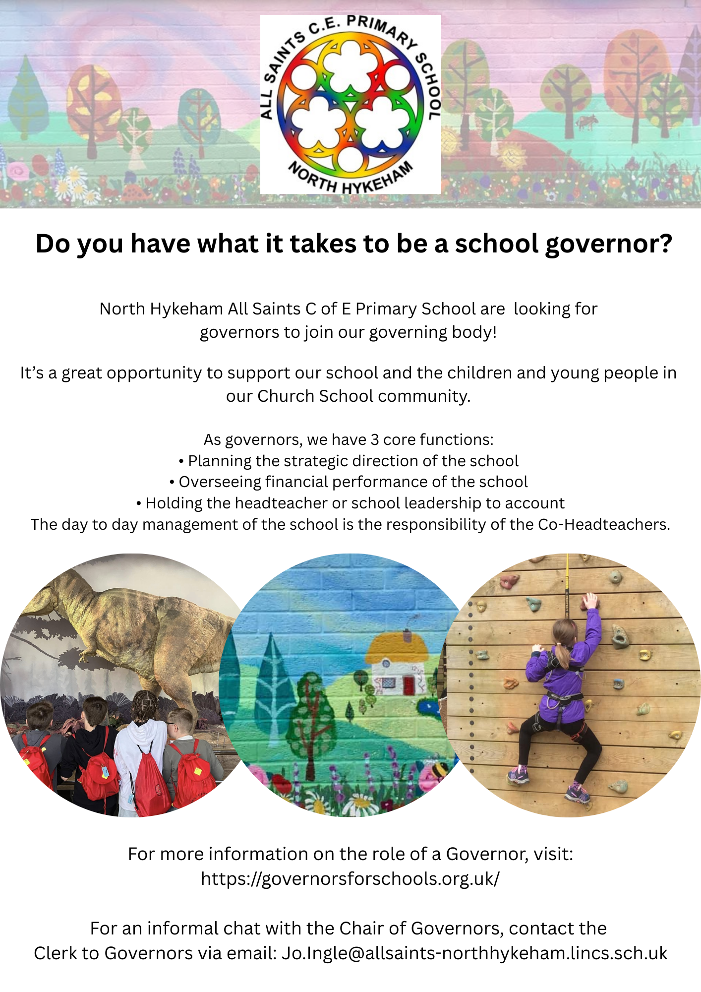 All Saints CofE Primary School, North Hykeham, is seeking new Governors. Please contact the school for more information: Jo.Ingle@allsaints-northhykeham.lincs.sch.uk